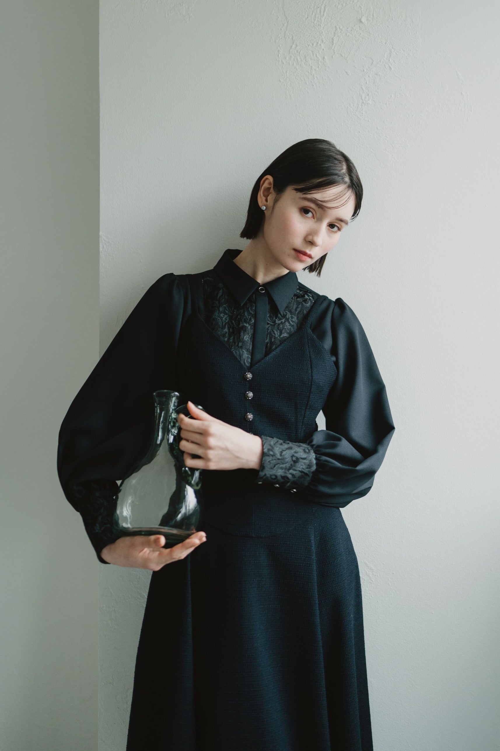 basque waist jacquard camisole dress / black