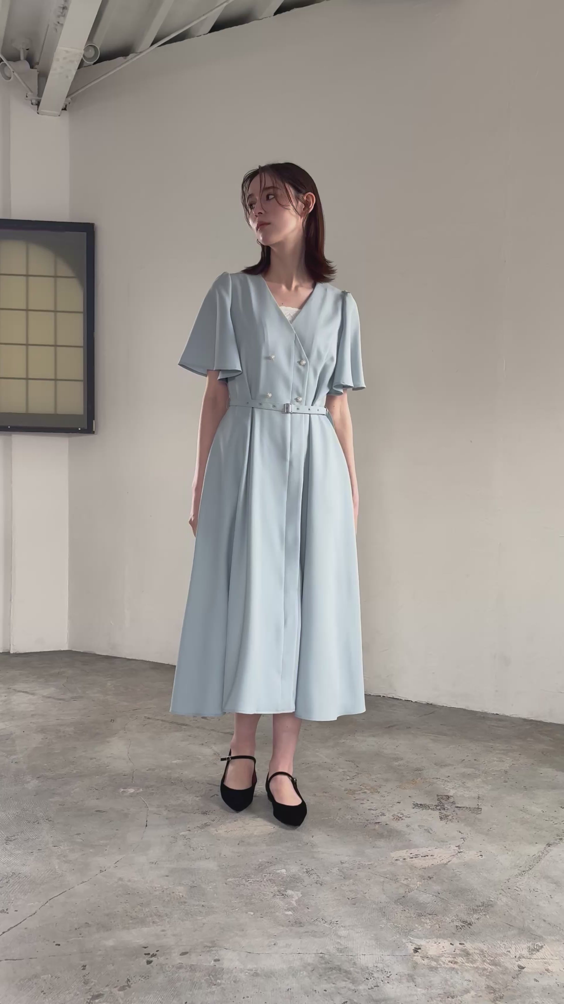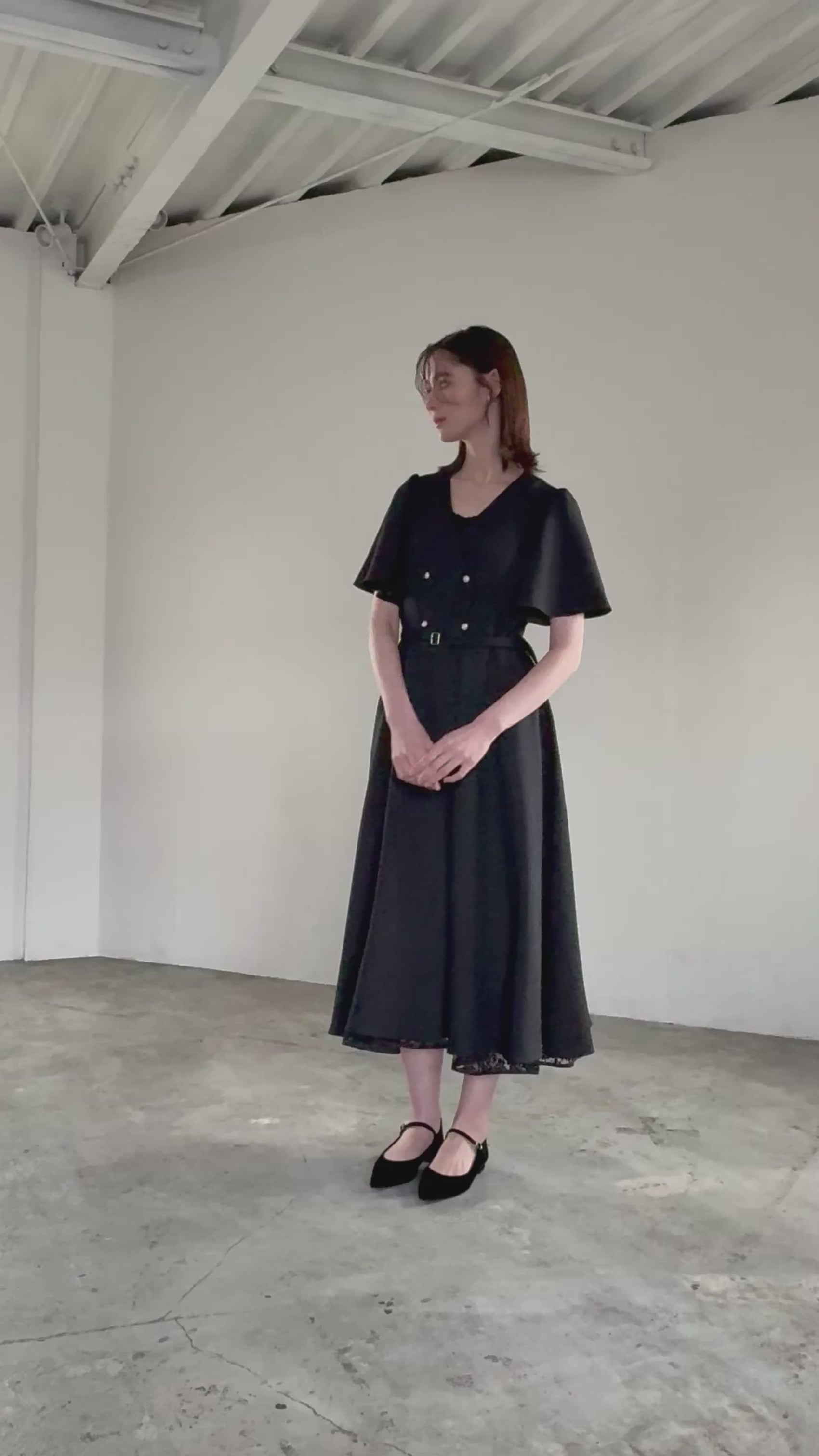 たっぷりとしたフレアスカートが軽やかに広がり、動くたびに優雅なシルエットを描きます。袖は柔らかく揺れるフレアスリーブで、腕周りをカバーし、すっきりと見せてくれるデザイン。