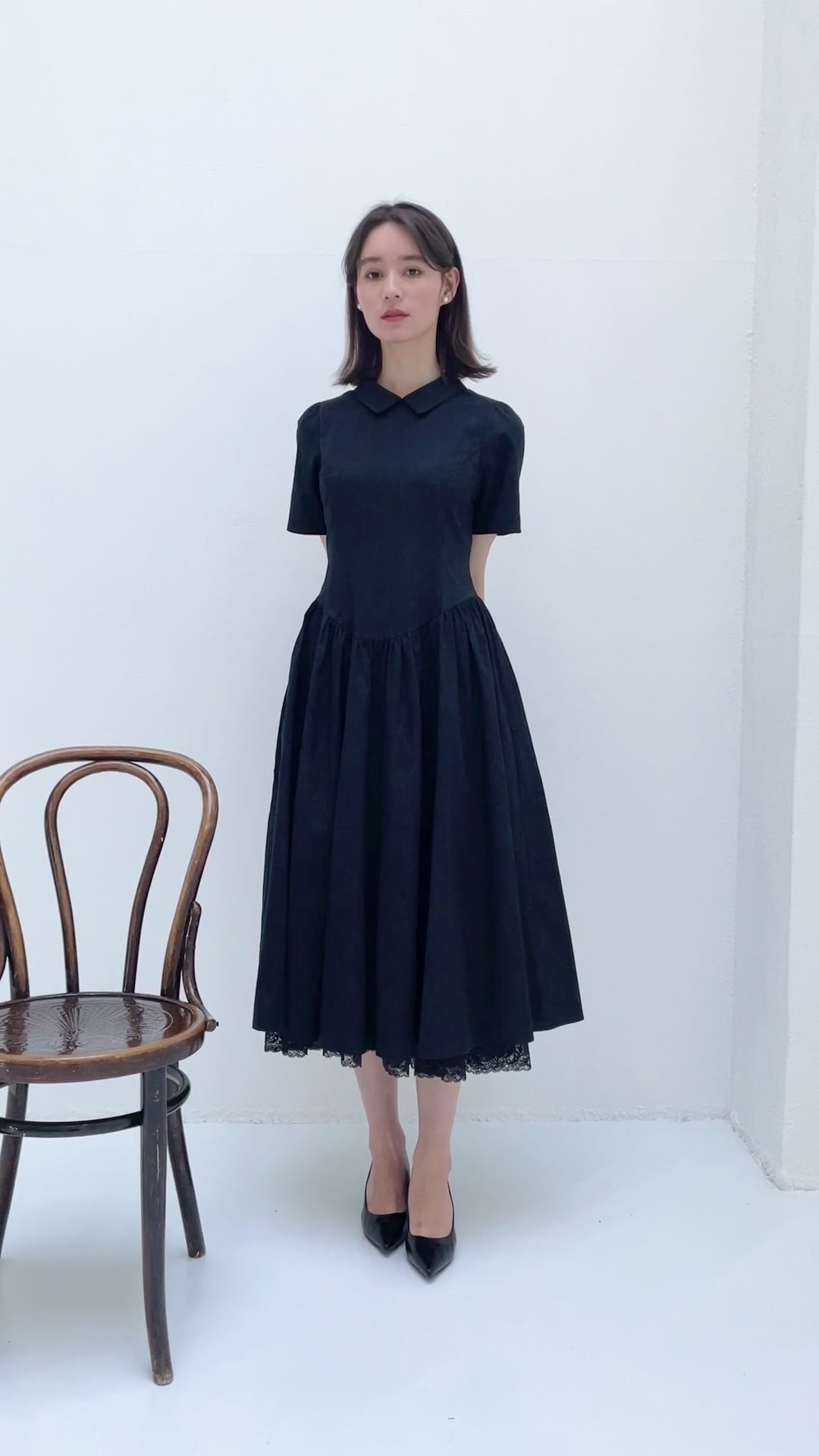 小ぶりな襟とコルセットのようなウエストの切り替えデザインで淑女のように上品な印象にみせてくれるドレス。