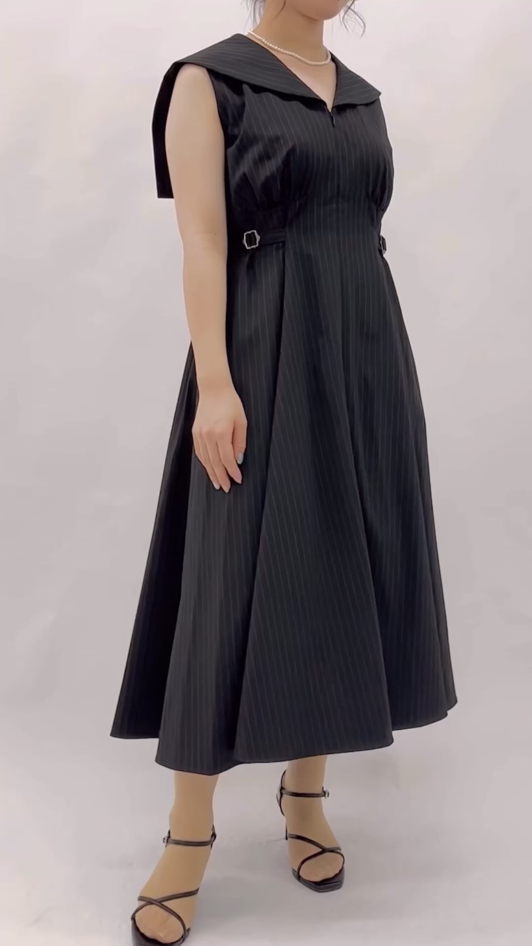 マニッシュな雰囲気が印象的なストライプ生地を使用したセーラーカラードレス。