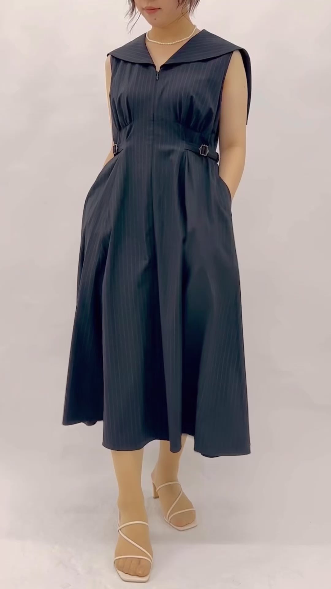 マニッシュな雰囲気が印象的なストライプ生地を使用したセーラーカラードレス。