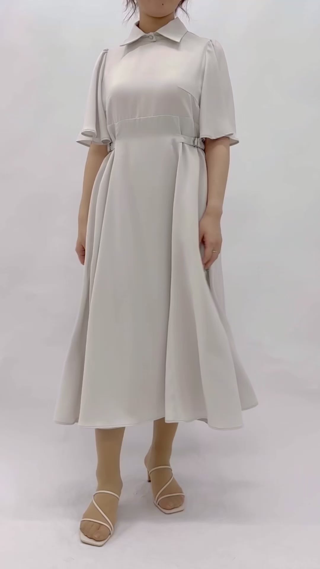 袖とスカート部分にたっぷりと入れたフレアが印象的なドレス。